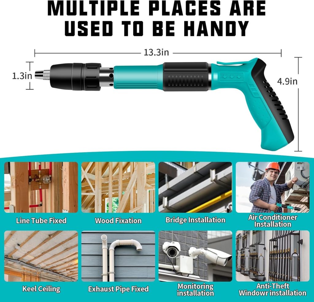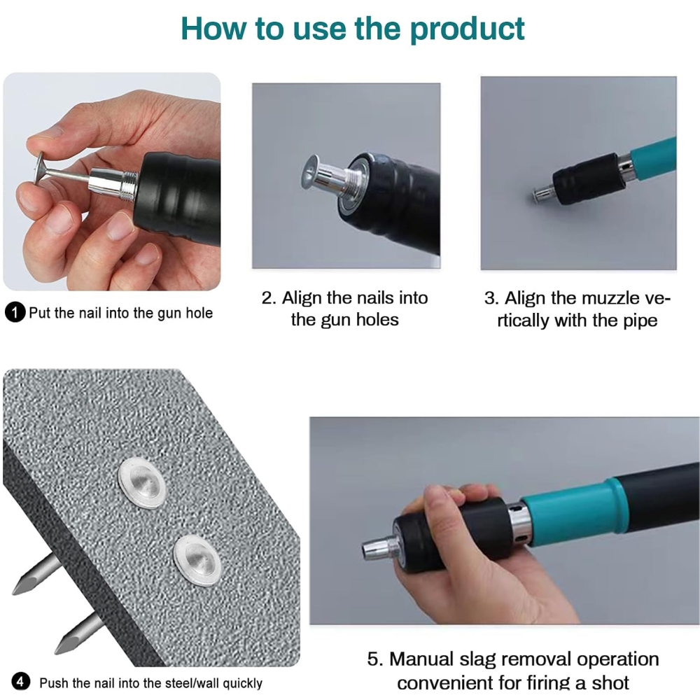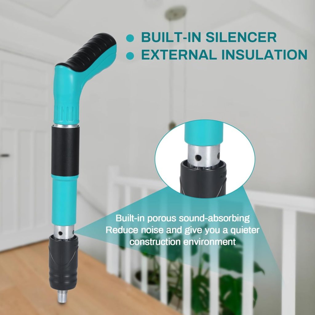 Our nail gun is compact and portable. One-button trigger for continuous nailing, dramatically improve the work efficiency; 5 levels of power adjustable, not afraid of hard objects, easily penetrate wood, concrete, steel plate and other materials, easy to use in a variety of scenarios, is a good helper for engineering installation. Dual silencers reduce noise and protect your ears during the work process. Perfect for indoor equipment installation, this tool is designed to provide convenience and efficiency.